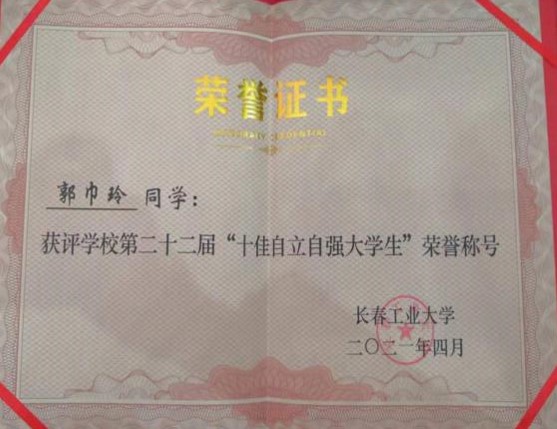 在校期间,曾获得2次国家励志奖学金,9次学业奖学金,3次单科状元;获得2020年度“长春市优秀共青团员”称号、司机社