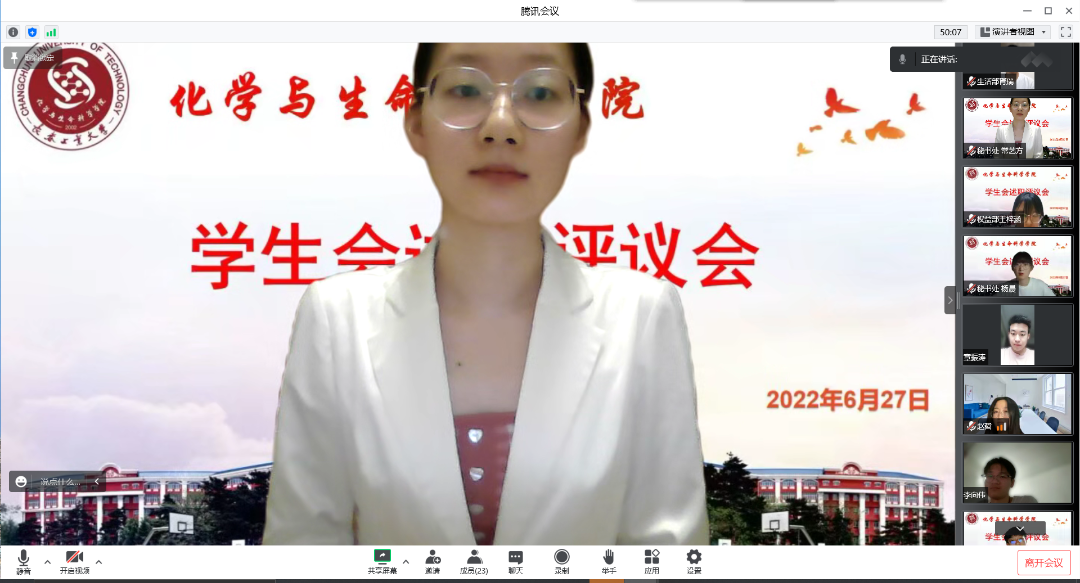 为深入推进学院学生会组织改革,全面加强对学院学生会工作人员的管理,提高学院学生会工作人员服务同学的意识和履职能力,做好学院学生会工作人员考核评价工作,6月27日,学院学生会在腾讯会议组织召开2021-2022年度第二学期学生会工作人员述职评议会。学院团委书记张鹏,学生会全体成员参加会议。