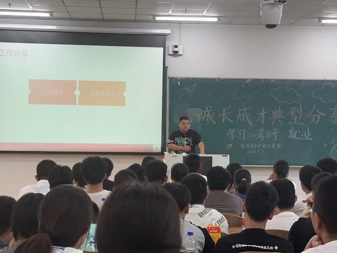 在生物专业成绩拿到第一名的喻浩瀚学长向大家做出了关于自己大学生活的分享,他就自己在大学中的学习生活、工作经历等方面展开了讲座,告诫大家在学习中要做到课前预习,认真听讲,课后复习,大胆提问,列出学习计划,为各位大一新生指明了学习方向,同时,他也向大家介绍了他在学团与志愿者活动之中的点滴,极大地激发了新生的学习兴趣。
