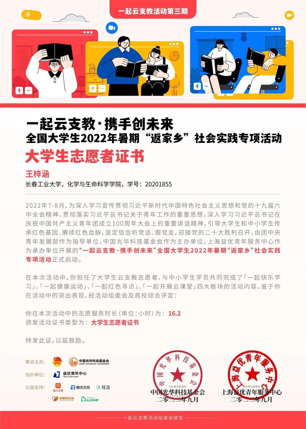 在认真完成学业和其他规定的学习任务的同时,我也注重综合素质的提高。工作中我勤恳认真、热心为同学服务,并积极配合学校、学院及班级的各项工作,秉承以人为本的观念为同学服务,踏踏实实,勤勤恳恳,尽职尽责地完成本职工作,并参加“一起云支教,携手创未来”全国大学生2022年暑期“返家乡”社会实践活动,荣获得优秀志愿者称号。并在2022年学校疫情防控工作中,担任学院疫情防控志愿者,累计服务时间21小时,负责北湖西区三栋栋派发物资等。