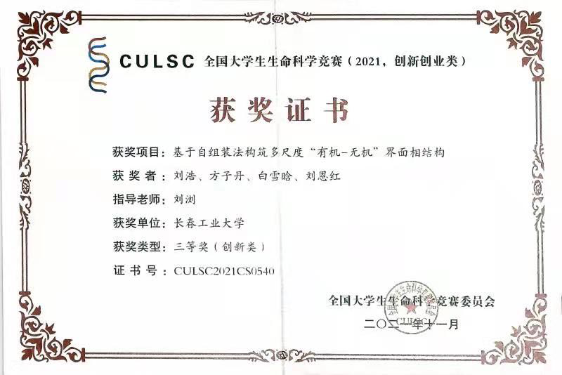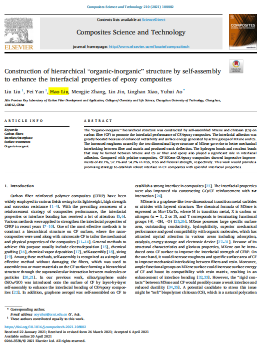 “天道酬勤”是沉淀在科技工作者基因血脉里的朴素信仰。在一个个平凡的日出日落间,一幕幕平常的实验场景中,大家都能看到刘浩同志的身影。作为一名理工类专业学生,她怀揣科技报国的理想追求。科研方面,在老师的指导下,该同志在本科期间就积极参与教师课题组科研项目,参与省级科创项目两项,以合著者身份在国际复合材料领域顶级期刊《Composites Science and Technology》(IF:9.1)上发表Construction of hierarchical “organic-inorganic” structure by self-assembly to enhance the interfacial properties of epoxy composites论文;在《Composites Part-B》(IF:13.1)上发表Water-based PEKC-COOH sizing agent for enhancing the interfacial adhesion of carbon fiber/polyether-ether-ketone composites论文。以项目负责人身份完成2021年度司机社