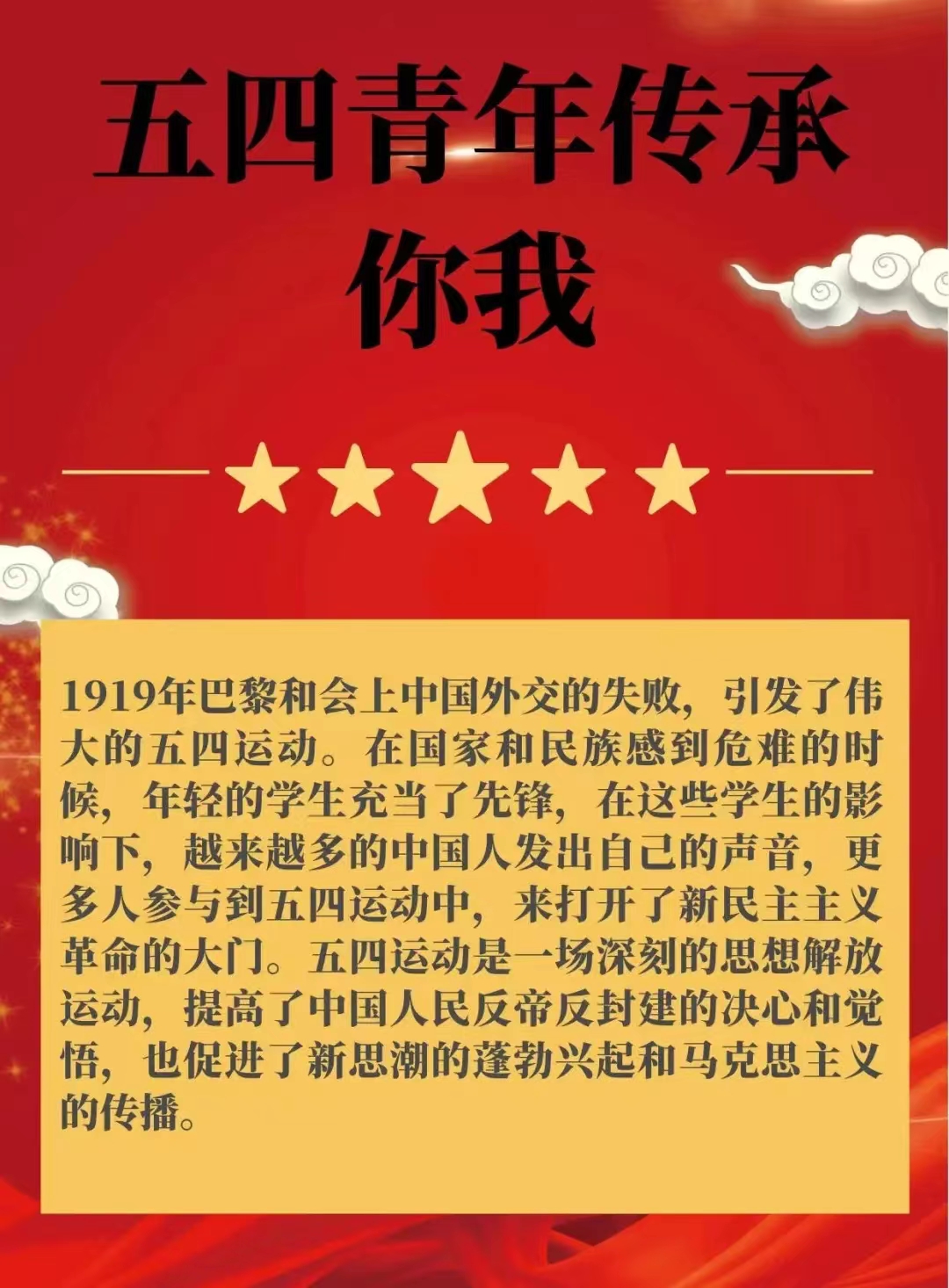 通过此次活动,同学们更加牢记五四精神,继续秉承前辈遗志,树立远大理想,“有一分热发一分光,就像萤火虫一般,也可以在黑暗里发一点光,不必等候炬火。”我们要立志用炽热的年华不断前行,追求更有高度、更有境界的人生。