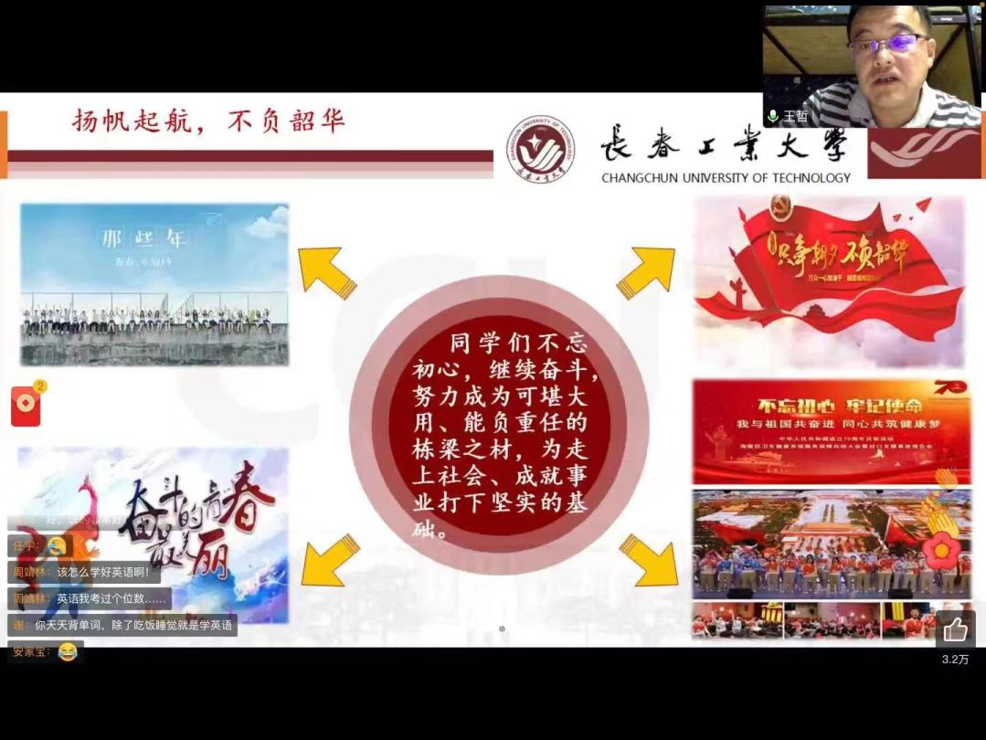 基本情况,使同学们对各专业及其就业前景有了更加深入的了解。同时,院长王哲鼓励同学们在学习专业知识的同时,也要重视加强体育锻炼,将刻苦、兴趣与韧性相结合,全面发展,以此激发科研潜力与学习动力。最后,王哲院长告诫同学们要严于律己,提高执行力,希望同学们在大学生活中明确目标与方向,努力做到脚踏实地,一步一个脚印。期待疫情结束,能够尽早开展线下教学,与同学们面对面交流。