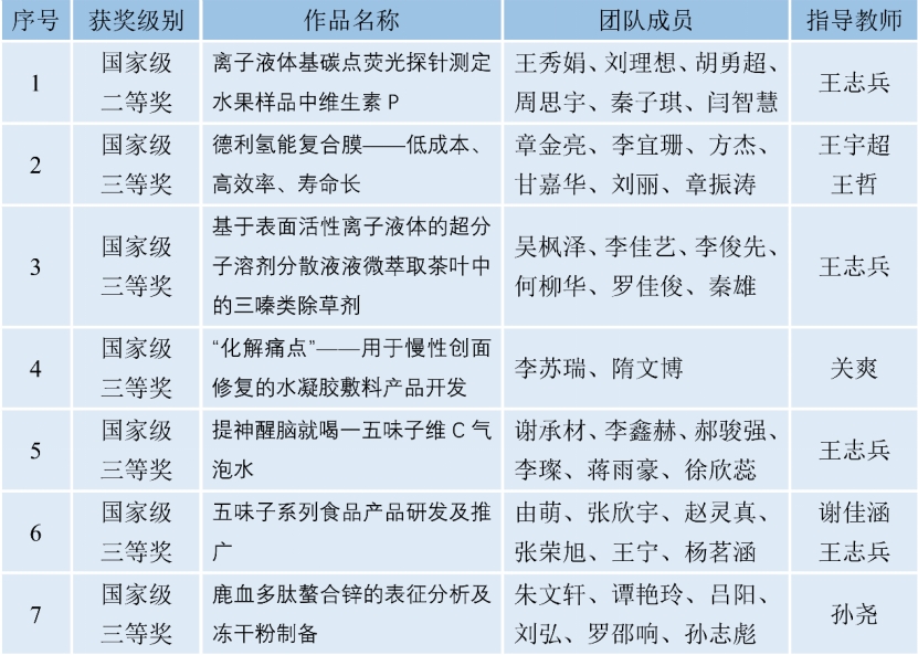王志兵老师指导,王秀娟等同学完成的《离子液体基碳点荧光探针测定水果样品中维生素P》荣获国家级二等奖,由王宇超和王哲老师共同指导、章金亮等同学完成的《德利氢能复合膜——低成本、高效率、寿命长》等6项作品荣获国家级三等奖。另外,司机社
