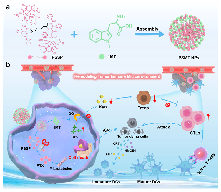 图1 制备PSMT纳米颗粒(a),及其通过PTX和1MT指导的重塑肿瘤免疫微环境对肿瘤进行自协同化学免疫治疗的示意图(b)
