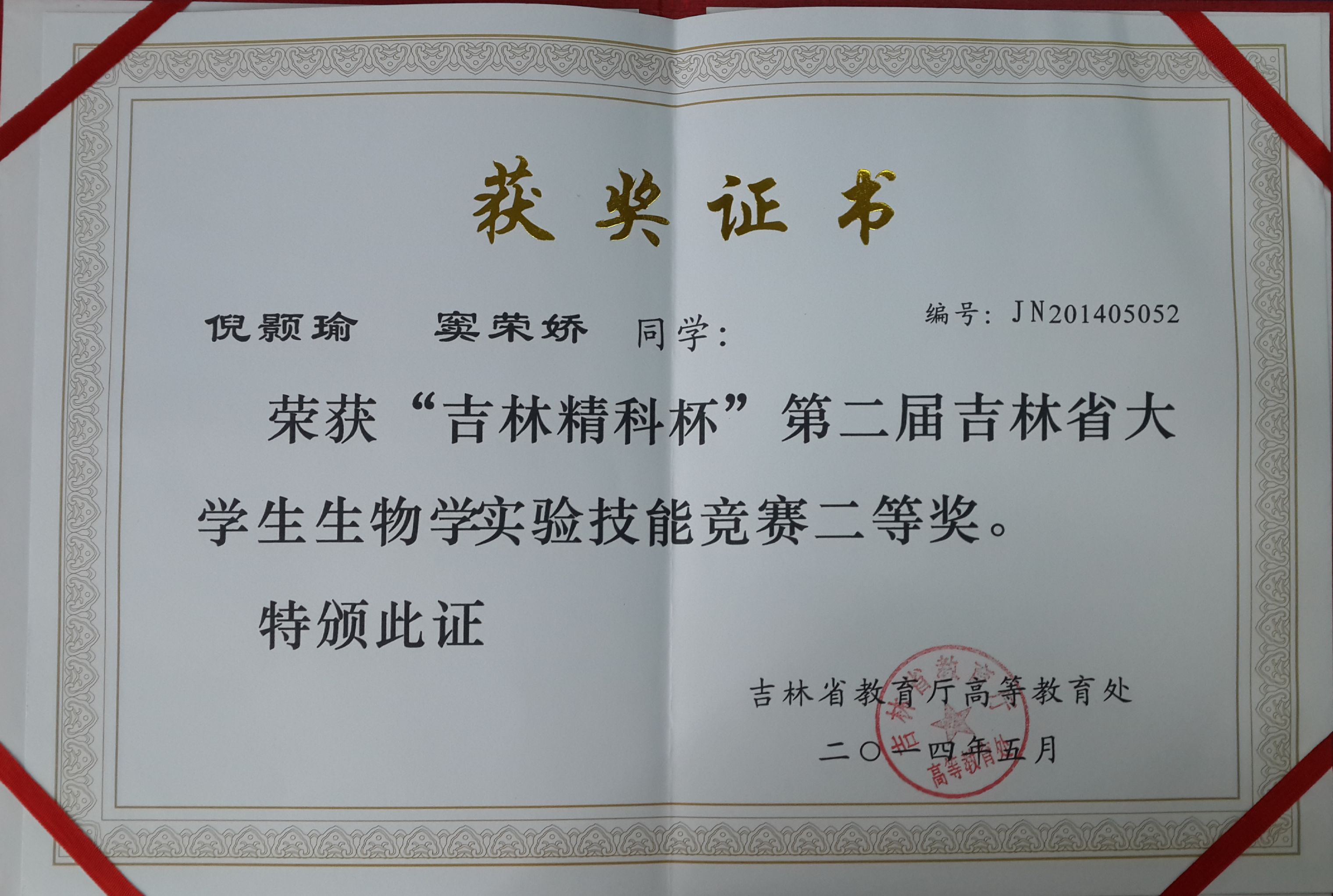 2014年“吉林精科杯”吉林省第二届大学生生物学技能竞赛二等奖(一)