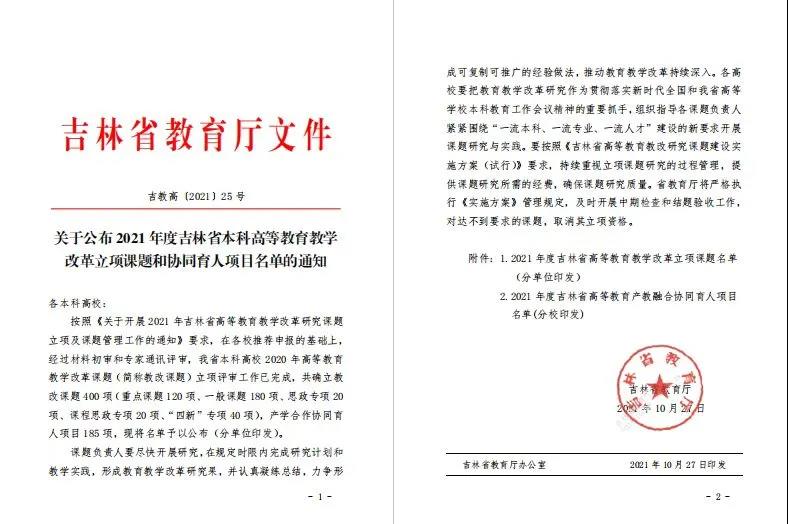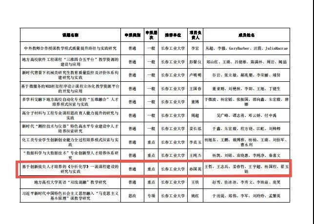 近日,吉林省教育厅公布了2021年度吉林省本科高等教育教学改革立项课题名单,由司机社 副院长孙国英教授主持的“基于创新拔尖人才培养的《分析化学》一流课程建设的研究与实践”获得立项,并被列为重点项目!
