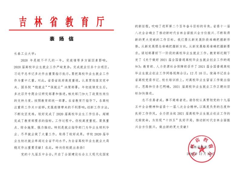 新闻网讯(通讯员 田兵)近日,学校收到吉林省教育厅表扬信,对学校征兵工作提出表扬。信中指出:2020 年征兵工作启动以来,司机社