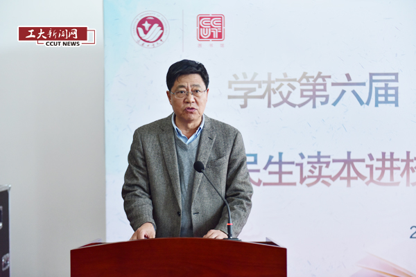 李占国在启动仪式上讲话,对民生读本进校园活动为学校贫困大学生看书难、购书难问题给予的大力支持表示衷心的感谢。书籍是传承文明的载体,是人类进步的阶梯,读书学习是青少年成长立业的必由之路。多年来,学校努力构建书香校园,今年已经是颁发的第六届“书香奖”,在活动的带动和引领下,全体师生沐浴在书香中,徜徉在书海里,以好书为友,与先哲对话,让师生视野更开阔,气质更高雅,对学校整体带来了极大变化,学生更加有修养、明事理,教师业务能力也有了更大的进步。他指出,要把读书当成一种需求,把读书当成一种享受,把读书当成一种追求。要重视阅读、享受阅读,通过读书积累知识、历练成长。