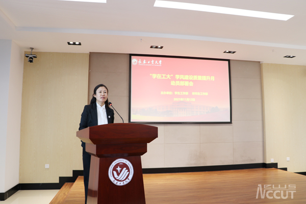 她强调,要统一思想,提高站位,深刻领会继续推进学风建设持续深入、常抓不懈的重要性和紧迫感,把思想、行动统一到党和国家及学校党委的决策部署上来,积极探索并建立学风建设长效机制;要突出重点,逐条细化,深入开展学风质量提升“十个一”重点工作,实心实意把“十个一”工作“十全十美”完成,向学校党委交上一份满意的答卷;要压实责任,强化督导,常态督查问效,注重育人功效,切实保证学风建设质量提升月活动走深走实见实效。