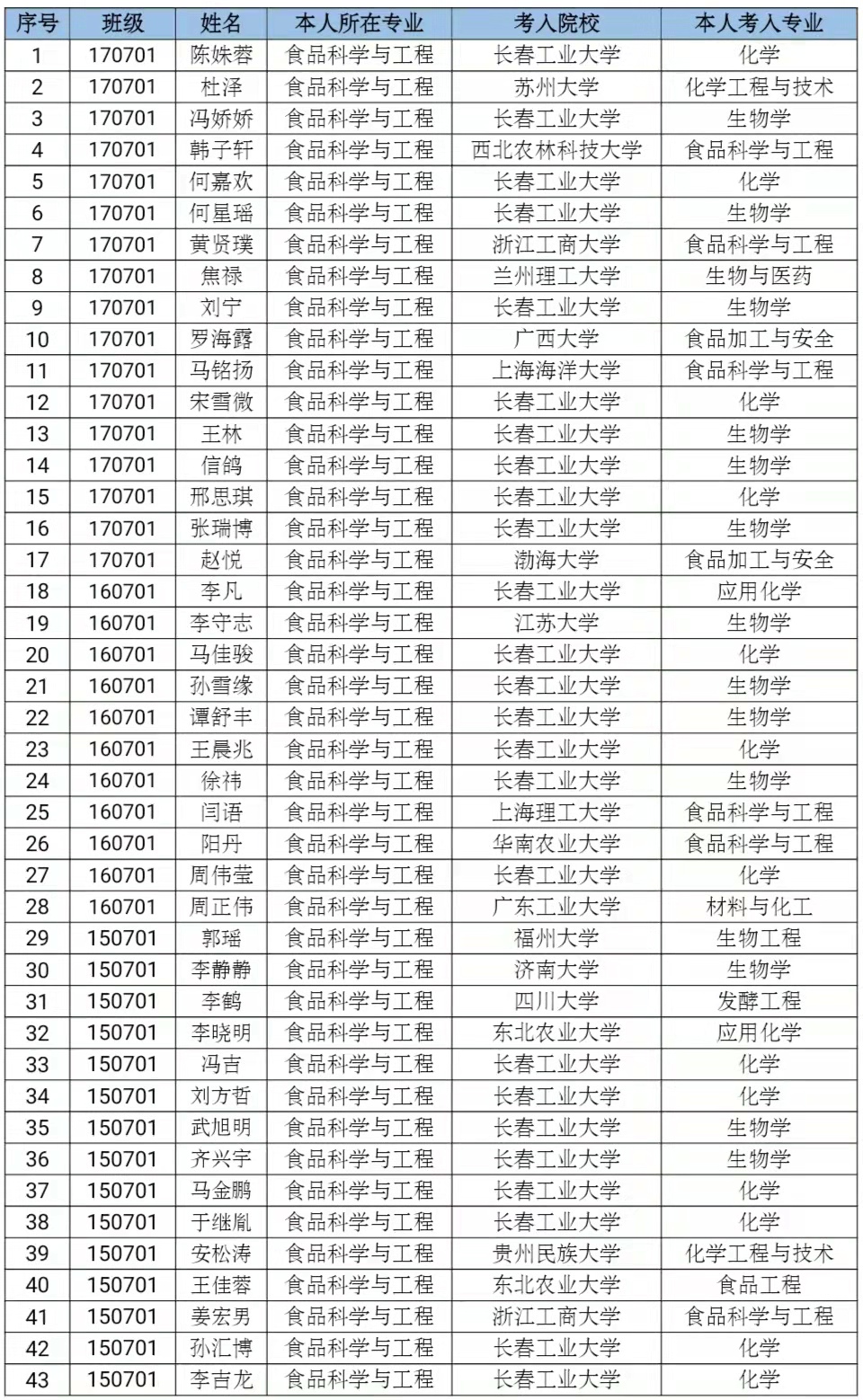 为促进学风建设,提高人才培养质量,为学生开辟更为广阔的发展空间,提高学生就业质量,进而满足社会对各层次人才的需求,食品科学与工程专业高度重视学生考研工作,从入学教育、专业教育工作着手,做好学生考研的引导和动员,正面引领,做好大学生职业规划设计,鼓励有继续深造潜力和考研愿望的学生树立信心,实现读研理想。近几年,学生通过努力分别考取吉林大学、东北师范大学、江苏大学、福州大学等多所985211院校,实现了人生的又一跨越。近三年,专业考研率分别为44.08%(2021)35.335%(2020)30.95%2019年)。